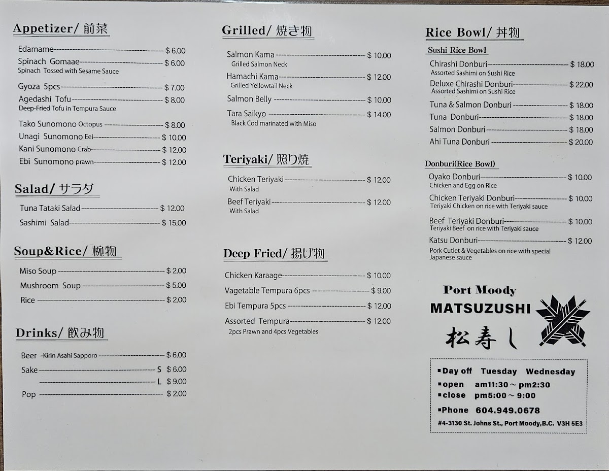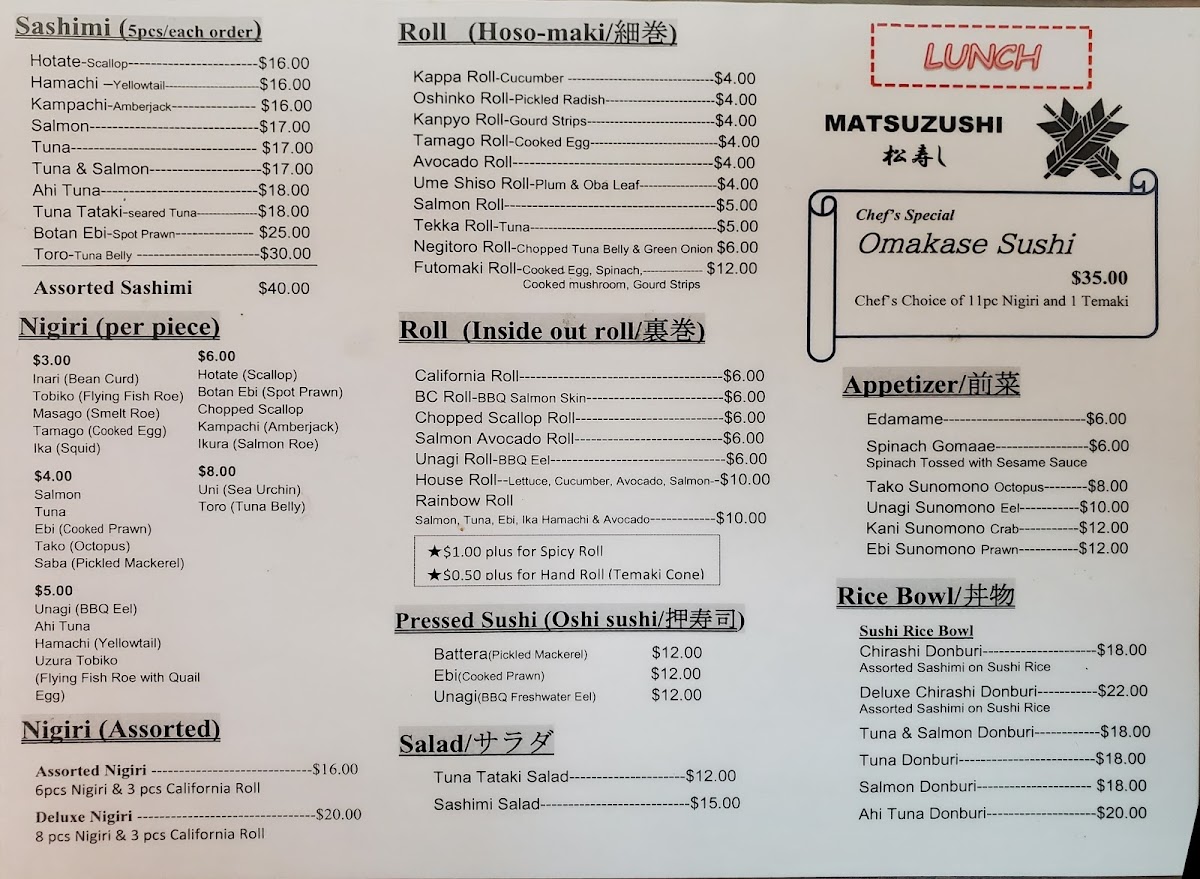 The menu at Matsuzushi reflects the refined simplicity of traditional Japanese dining, offering a thoughtful selection of sushi and sashimi that highlight fresh, high-quality ingredients. It’s the kind of place where each dish is crafted with care, inviting guests to savor clean, delicate flavors in a calm and intimate setting.